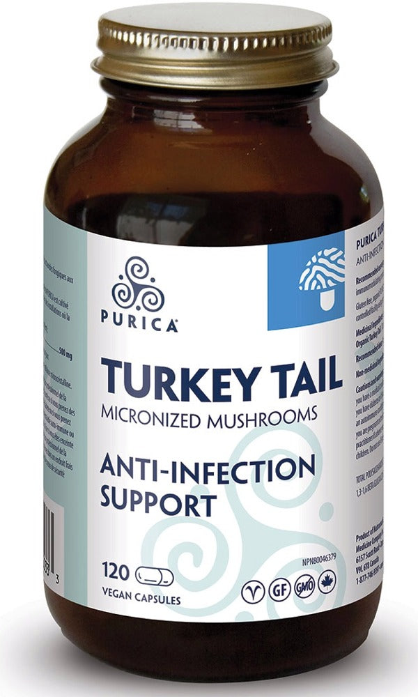 Purica - Turkey Tail (Coriolus) - 120 vegan Capsule(s) - NPN: 80046379 -- Turkey tail (Coriolus) is undoubtedly the most common fungus in the world and one of the most important medicinal mushrooms to promote energy, longevity and rejuvenation. Turkey tail has been used for hundreds of years as a natural treatment for many diseases.This potent mushroom is perhaps the most potent and medicinal of all medicinal mushrooms. It increases the immune system response, which can counter chronic fatigue, reduces phlegm and is helpful for all pulmonary disorders; good for all liver, urinary, and digestive tract disorders.PSP and PSKPSP, the abbreviation of PolySaccharoPeptide can only be extracted from the Coriolus versicolor mushroom. Over the past 20 years, extensive research including clinical trials has been conducted on identifying the active ingredient groups of PSP and elucidating its immune health benefits in the body.Coriolus possesses immune supporting benefits and enhances our immune surveillance in weak immune systems. Studies have shown that PSP boosts the activity of natural killer cells, simulates the production of interleukin-2 and increases the ratio of helper T cells.In Traditional Chinese Medicine, Coriolus is used to heal pulmonary disorders, strengthen the physique, increase energy and benefit people with chronic diseases. TCM doctors consider it a useful treatment for infection and/or inflammation of the upper respiratory, urinary and digestive tracts. Coriolus is also regarded as curative to liver ailments and is used to treat general weakness of the immune system