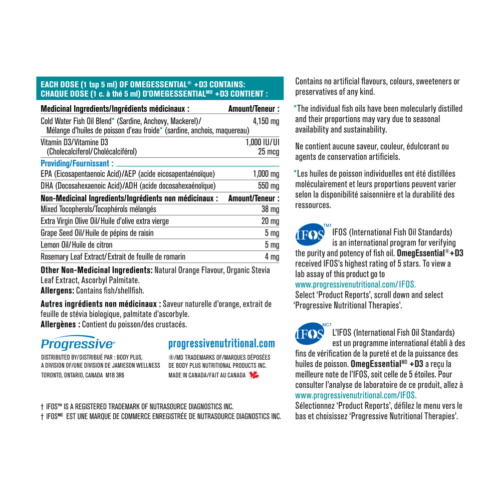 PROGRESSIVE - OmegEssential + D Liquid - 500 Millilitres - NPN: 80107105 -- Progressive OmegEssential High Potency Fish Oil is an extra strength liquid fish oil supplement formulated for daily use. Taking fish oil daily helps to promote cognitive, cardiovascular and overall good health. Molecularly distilled to remove all unwanted contaminants