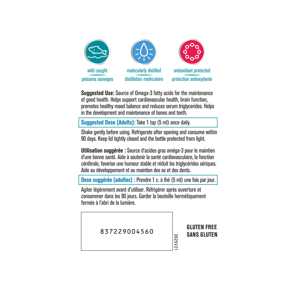 INGREDIENTSMedicinal Ingredients Cold Water Fish Oil Blend (Sardine, Anchovy, Mackerel) ~2,750 mg Vitamin D3 (Cholecalciferol) 1000 IU/UI 25 mcg Providing EPA (Eicosapentaenoic Acid) 1.000 mg DHA (Docosahexaenoic Acid) 550 mg Mixed Tocopherols 38 mg Extra Virgin Olive Oil 20 mg Grape Seed Oil 5 mg Natural Lemon Oil 10 mg Rosemary Leaf Extract 5 mg Non-Medicinal Ingredients Sunflower Oil, Natural Orange Flavour, Stevia Leaf Extract. Allergens Contains fish.