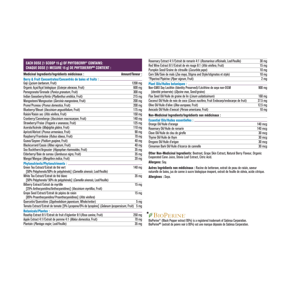 PROGRESSIVE - PhytoBerry - 900 Gram(s) - NPN: 80036256 -- PhytoBerry is a highly concentrated berry based whole food supplement that is loaded with natural antioxidants. Featuring over 40 high ORAC value fruit concentrates, phytonutrients, essential fatty acids and herbal extracts, PhytoBerry is specifically designed to offer whole body antioxidant® protection. A single serving has the equivalent nutrient content of 6 to 8 servings of fresh fruit. Highly concentrated whole food supplement Over 40 ORAC rich food concentrates, phytonutrients and essential fatty acids ORAC score of ~5000 units Nutrient equivalent of 6 8 servings of fresh fruit Outstanding source of botanical nutrients Professionally formulated and energetically balanced