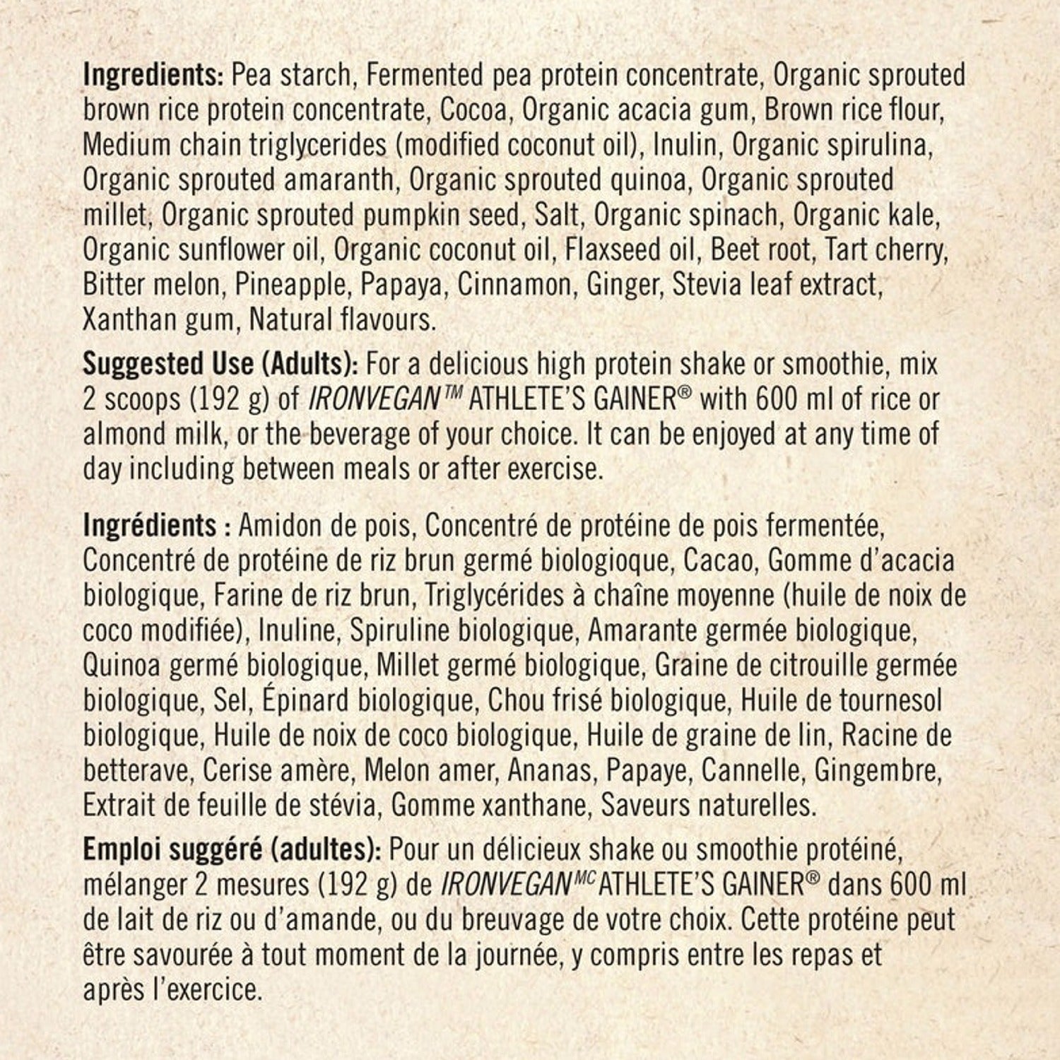 IRON VEGAN Athlete’s GAINER™ is a plant-based, high protein, high calorie supplement formulated to support healthy weight gain. ATHLETE's GAINER provides you with 720 clean calories at a 2.85:1 carbohydrate to protein ratio so that you can gain high-quality muscle mass. This great tasting, smooth formula is formulated for ingredient-conscious athletes to build muscle and improve physical performance.