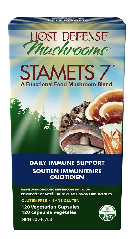 Host Defense® Stamets 7® Capsules use activated, freeze-dried, Certified Organic mycelium, with a full spectrum of constituents: polysaccharides (beta glucans, arabinoxylane, glucose, xylose, galactose and cordycepic acid), glycoproteins, ergosterols, triterpenoids and other myco-nutrients, which are essential for Supporting Natural Immunity.Paul Stamets designed this blend of seven mushroom species (Royal Sun Blazei, Cordyceps, Reishi, Maitake, Lions Mane, Chaga and Mesima) to support general immunity.