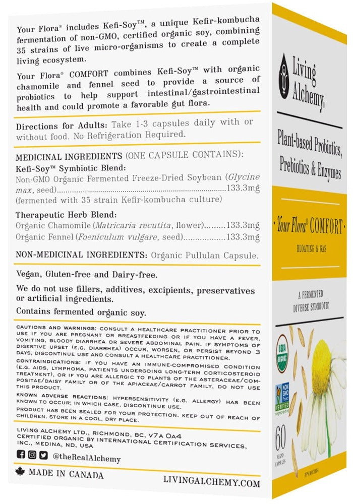 LIVING ALCHEMY - Your Flora® Comfort: Gas & Bloating - 60 Capsule(s) - NPN : 80071884Helps Relieve Digestive Bloating & GasCalms Stomach CrampingFast Acting & Long LastingOptimizes Healthy Gut Flora & Immune SupportExpertly formulated, Living Alchemy Your Flora Comfort is a fermented whole food Symbiotic that helps relieve gas, bloating and stomach cramping caused by an imbalance of gut microflora.Your Flora Comfort uses a unique living culture fermentation process Symbio, a traditional Kefir-Kombucha fermentation with diverse strains of live micro-organisms, combined with organic chamomile and fennel seed specifically for those requiring gut flora support with digestive gas and bloating or stomach cramping.Powered by Kefi-Soy, Your Flora Comfort is a unique formula with diverse strains of probiotics, prebiotics, enzymes and nutrients to support daily digestion, immunity and gastrointestinal health.One Complete Digestive Solution: Your Flora SymbioticsProvides Probiotics, Prebiotics & Digestive Enzymes80% Survival Rate of Microbes in the GutDiverse Strain Kefir-Kombucha FermentationPlus Organic Chamomile & Fennel SeedSuperior AbsorptionShelf stable. No Refrigeration Required