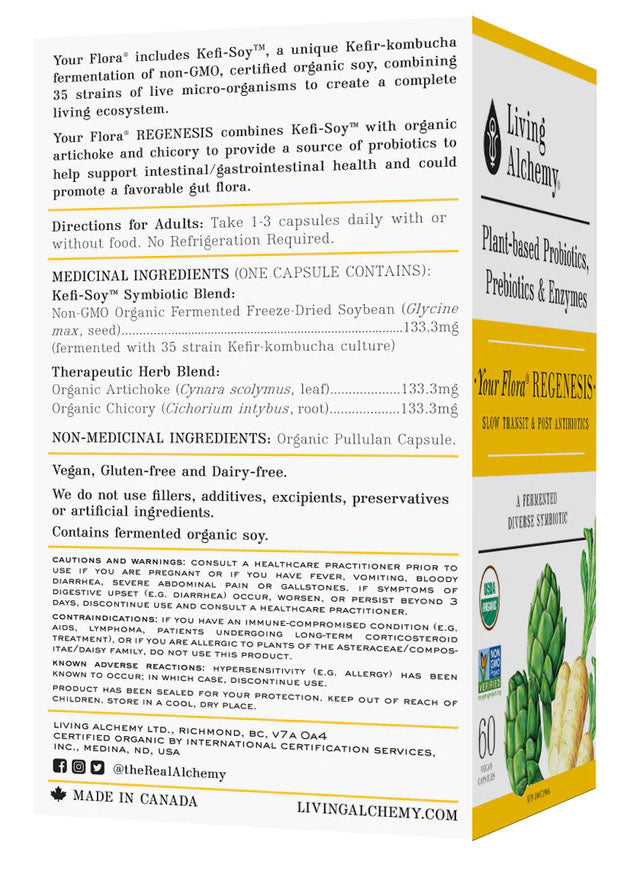 Living Alchemy - Your Flora® REGENESIS: Slow Transit & Post Antibiotics - 60 Vegan Capsule(s) - NPN:80071906 -- Alleviates Bowel Congestion & Improves Transit TimePost Antibiotics or InfectionAids Liver FunctionsHelps Support Intestinal/Gastrointestinal Health & Promotes a Favorable Gut FloraLiving Alchemy Your Flora Regenesis provides probitotics, prebiotics and digestive enzymes as well Organic Kefi-Soy to help create a natural harmony of micorflora in the digestive tract. Formulated to optimize healthy gut flora and immune support, Your Flora Regenesis alleviates bowel congestion while aiding living functions. Your Flora Regenesis is shelf stable; meaning it requires no refrigeration.There are times when it is necessary to restore your gut flora. Establishing a healthy gut flora is a journey, not a race. Kefi-Soy provides the ideal foundation for you to naturally create and develop a rich and diverse ecosystem specific to you and your unique constitution.Your Flora REGENESIS combines our fermented Diverse Strain Kefir-Kombucha Fermentation Symbiotic with organic artichoke and chicory specifically for those aiming to re-establish a healthy digestive ecosystem and smooth digestive function.One Complete Digestive Solution: Your Flora SymbioticsProvides Probiotics, Prebiotics & Digestive Enzymes80% Survival Rate of Microbes in the GutDiverse Strain Kefir-Kombucha FermentationPlus Organic Blueberry & BananaSuperior AbsorptionShelf stable. No Refrigeration RequiredWhole Food Source Symbiotics