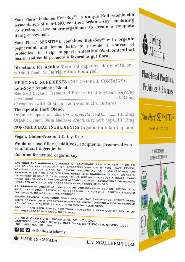 LIVING ALCHEMY Your Flora Sensitive - 60Vegan Capsule(s) - NPN : 80071921-- Calms Irritable Digestion Cools Digestive Irritation Relaxes Stressed Digestion Helps Support Intestinal & Gastrointestinal Health Promotes a Favorable Gut FloraYour Flora SENSITIVE combines our fermented Diverse Strain Kefir-Kombucha Fermentation Symbiotic with organic peppermint and lemon balm specifically for those requiring gut flora support that relaxes stressed digestion and cools irritation.A healthy gut flora is important in helping conditions associated with digestive sensitivity. Kefi-Soy helps maintain a healthy state of gut flora and much more from its digestive nutrients. Kefir comes from the Turkish word good feeling due to its calming properties. One Complete Digestive Solution: Your Flora Symbiotics Provides Probiotics, Prebiotics & Digestive Enzymes 80% Survival Rate of Microbes in the Gut Diverse Strain Kefir-Kombucha Fermentation Plus Organic Peppermint & Lemon Balm Superior Absorption Shelf stable. No Refrigeration Required Whole Food Source Symbiotics