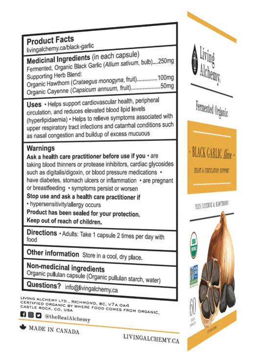 Living Alchemy - Black Garlic Alive - 60 vegan Capsule(s) - NPN : 80115960Supports Cardiovascular HealthImproves CirculationReduces Elevated Blood Lipid LevelsRelieves Upper Respiratory Symptoms (nasal congestion & excess mucus)Promotes Healthy Aging & ImmunityLiving Alchemy Black Garlic Alive is fermented organic whole garlic aged to perfection for cardiovascular and circulatory support, while promoting healthy immunity, aging and well-being.