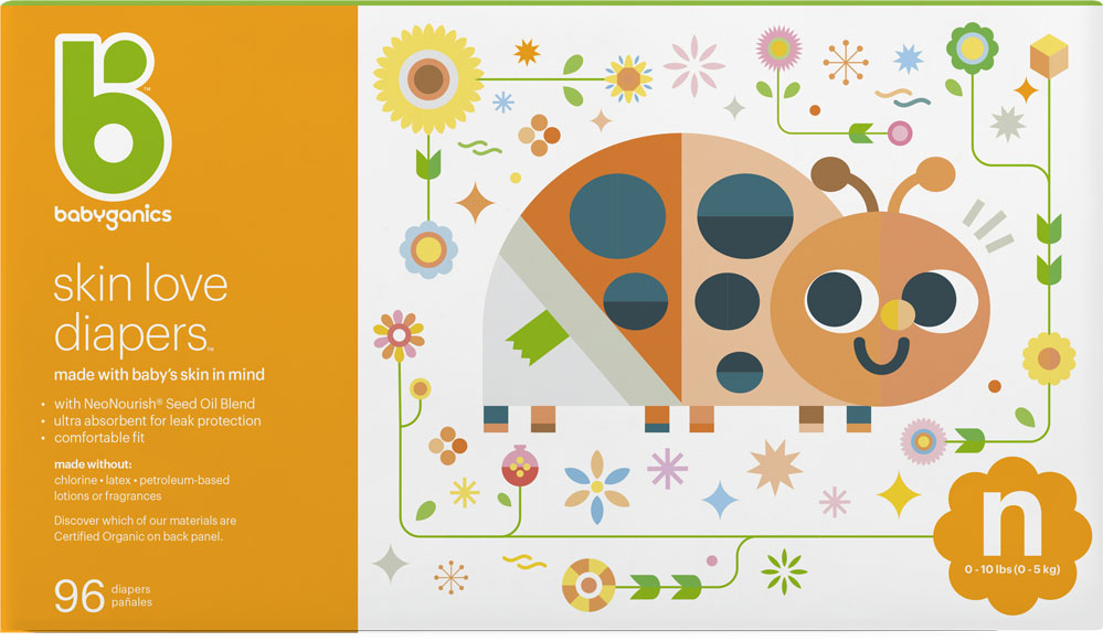 Babyganics - Diapers - Newborn - 32 Count - NPN: 00000000 -- Skin Love DiapersDiapers can be hard on the wallet and your babys sensitive skin. Thats why weve designed our skin love diapers to better fit your values and your baby. Made with our new blend of plant-derived and thoughtfully chosen materials, our diapers are intended for superior comfort & fit and enhanced absorbency. The way your baby tears through diapers, you deserve one thats just about perfect. So go ahead and buy them by the ton, so you can appreciate them one by one.Formulated without: chlorine, latex, petroleum based lotions or fragrancesFormulated with NeoNourish® Seed Oil Blend: our own blend of tomato, sunflower, cranberry, black cumin and raspberry seed oilsPlant-derived ingredients and other ingredients chosen with your babys skin in mind. Learn about these and all our ingredientsChlorine freePremium fitPremium absorbencySoft-stretch sidesLeak controlWetness indicator